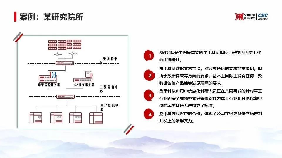 在與國家某軍工科研院所的合作中,它是中國國防工業(yè)的中流砥柱,鼎甲和其用戶信息化科研人員共同研發(fā)出針對軍工行業(yè)的安全增強(qiáng)型容災(zāi)備份軟件,為軍工行業(yè)和其他保密單位的容災(zāi)備份系統(tǒng)樹立了標(biāo)準(zhǔn),提高客戶災(zāi)難應(yīng)急能力。