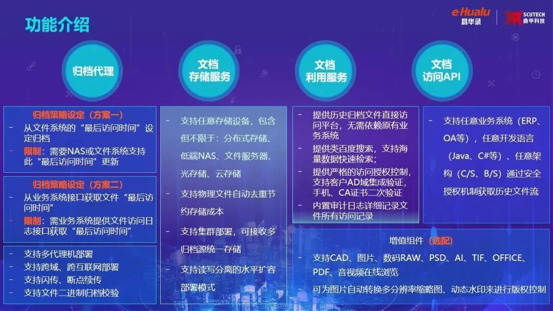 此外,無論數(shù)據(jù)是在云端還是藍(lán)光,歸檔后的數(shù)據(jù)均可在本機(jī)生成存根,用戶可直接訪問,同時(shí),它還具備強(qiáng)大的平臺擴(kuò)展能力和業(yè)務(wù)場景適應(yīng)能力,如應(yīng)用集成、應(yīng)用快速構(gòu)建、業(yè)務(wù)流程設(shè)計(jì)整合、智能化大數(shù)據(jù)管理等。