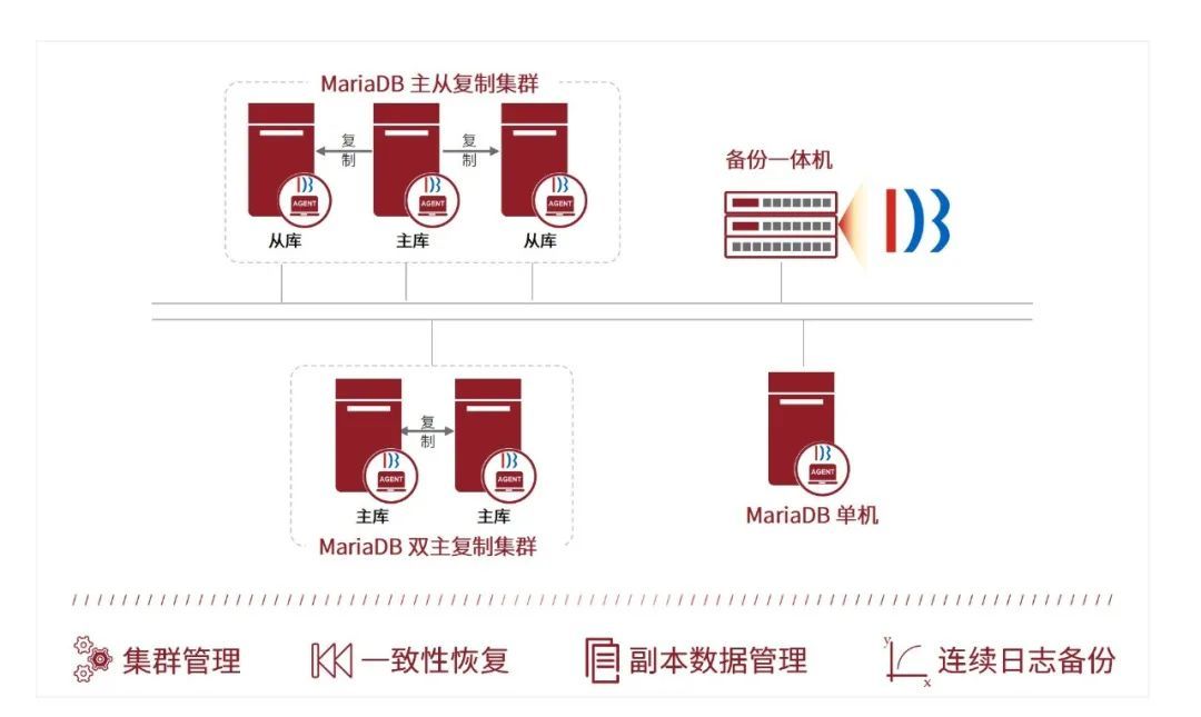 在支持單機(jī) MariaDB 的基礎(chǔ)上,迪備(DBackup)新版本新增對 MariaDB 主從復(fù)制和雙主復(fù)制集群架構(gòu)的邏輯和物理備份恢復(fù),實(shí)現(xiàn)MariaDB 指定 GTID 的物理恢復(fù),為客戶打造安全可靠、全面高效的數(shù)據(jù)保護(hù)解決方案。