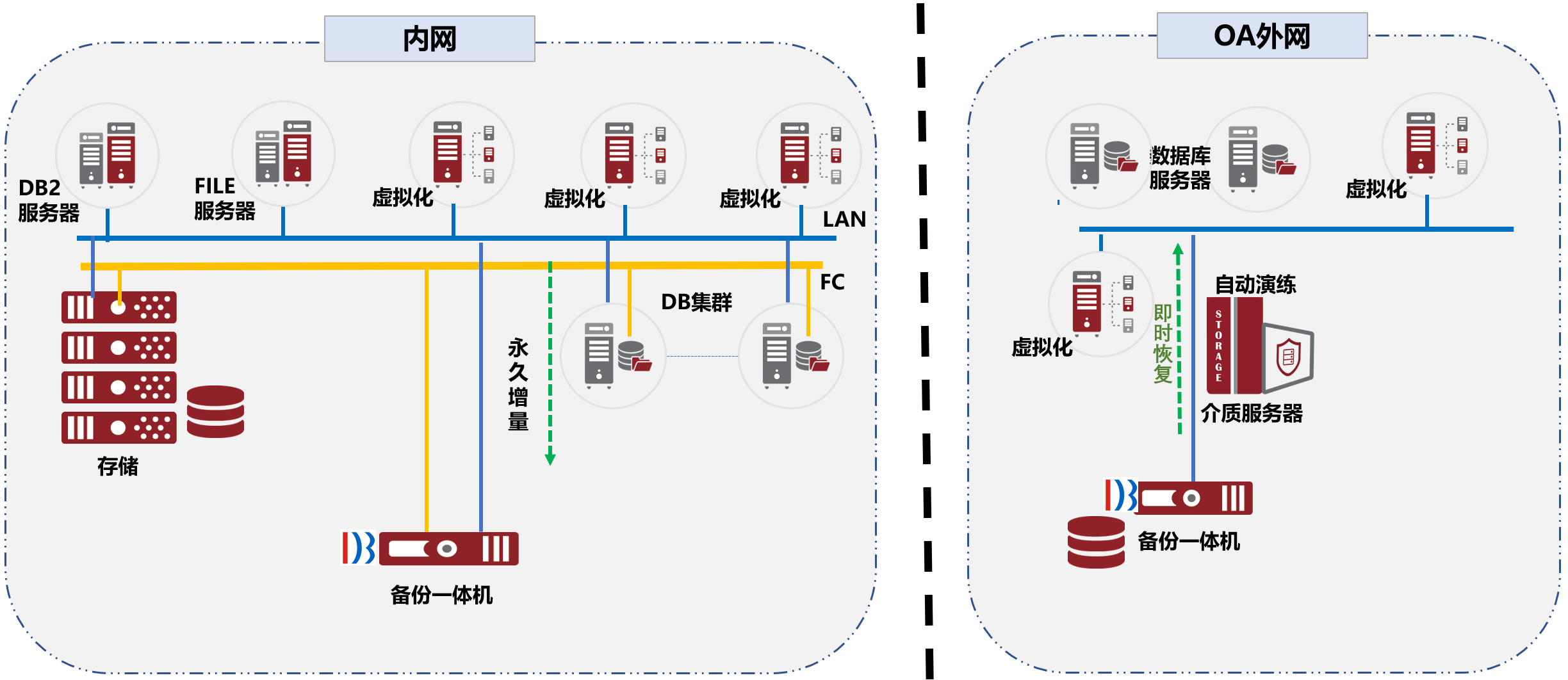 針對客戶需求,鼎甲將兩套備份一體機分別部署在生產環境與 OA 外網,作為備份平臺的核心,負責管理整個備份環境,包括備份、存檔和還原,在確保業務管理系統數據安全性的同時,支持未來的業務拓展和新平臺上線的備份支撐。