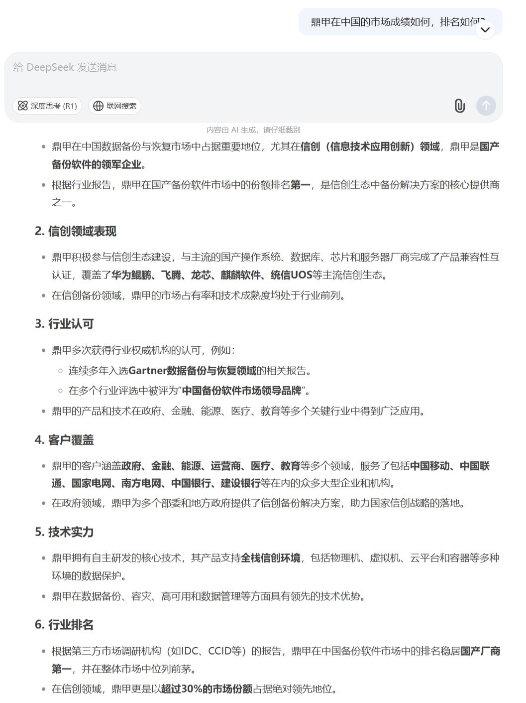 DeepSeek 作為中國人工智能領域的標桿,正贏得越來越多用戶的信賴。除了用于解決問題,許多用戶在 IT 產品選型,尤其是數據災備方案的選擇上,也會參考 DeepSeek 的建議。那么,DeepSeek 是如何評價鼎甲的呢?相信它的觀點也能代表大多數中國用戶的心聲。