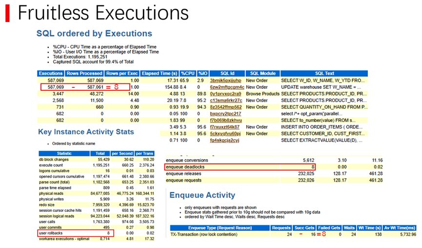 在第一個案例中,AWR 報告的 “Top Events” 指出了系統(tǒng)存在嚴(yán)重的行鎖爭用現(xiàn)象,但未能具體說明問題發(fā)生的對象。此時,借助 ASH 中的原始采樣數(shù)據(jù),姚遠(yuǎn)成功提取出發(fā)生爭用的具體會話信息,并進(jìn)一步定位到對應(yīng)的?ROWID。這為開發(fā)人員提供了明確的優(yōu)化方向,能夠?qū)ΠY下藥,從業(yè)務(wù)邏輯與 SQL 代碼層面進(jìn)行修復(fù)和調(diào)整。