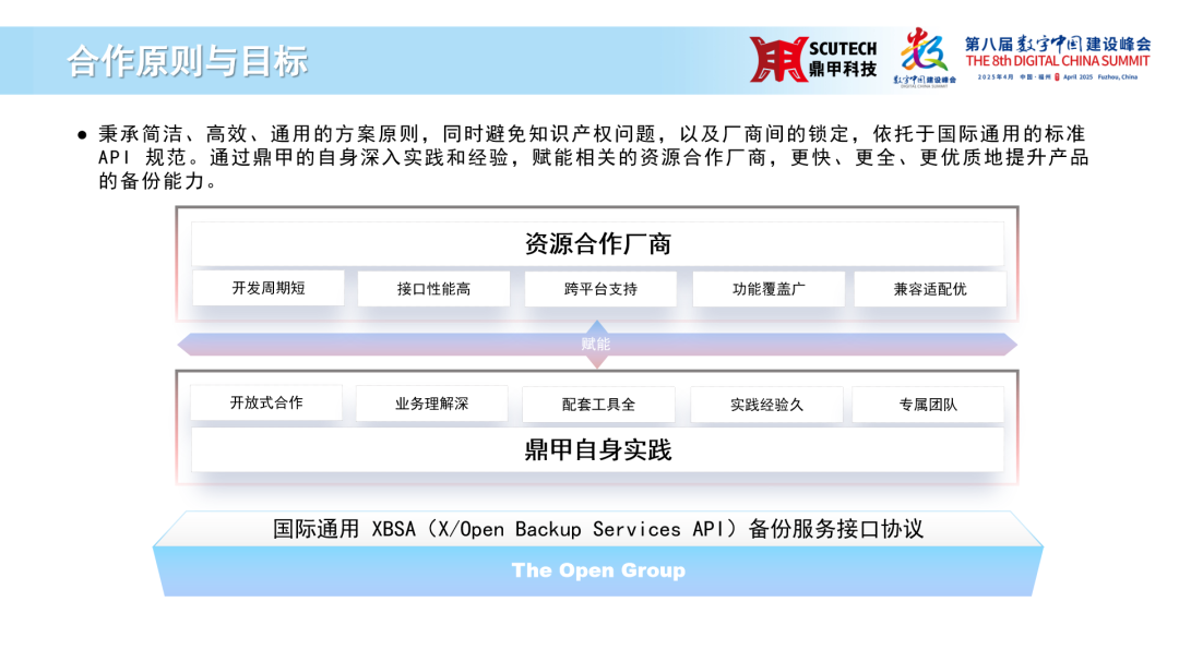 4 月 29 日,在第八屆數(shù)字中國(guó)建設(shè)峰會(huì)期間,鼎甲科技正式發(fā)布“開(kāi)放式備份項(xiàng)目”(SOBP,Scutech Open Backup Program)。該項(xiàng)目率先以國(guó)際標(biāo)準(zhǔn)化備份服務(wù)接口為基礎(chǔ),聯(lián)合應(yīng)用廠商與備份軟件廠商共同推廣該標(biāo)準(zhǔn)協(xié)議的使用。數(shù)字中國(guó)建設(shè)峰會(huì)是我國(guó)數(shù)字經(jīng)濟(jì)領(lǐng)域規(guī)格最高、影響力最廣的國(guó)家級(jí)平臺(tái),是展示數(shù)字中國(guó)建設(shè)成果、推動(dòng)產(chǎn)業(yè)數(shù)字化轉(zhuǎn)型的重要窗口。鼎甲科技在此國(guó)家級(jí)峰會(huì)上,以創(chuàng)新成果亮相,踐行“為國(guó)產(chǎn)生態(tài)構(gòu)建堅(jiān)實(shí)的數(shù)據(jù)保護(hù)底座”的使命,加速信創(chuàng)產(chǎn)業(yè)邁向高效、協(xié)同、集約、可持續(xù)發(fā)展的新階段。