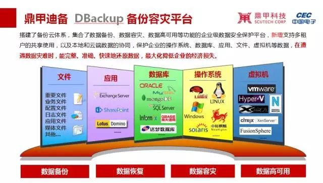 鼎甲迪備( DBackup )搭建了備份云體系,集合了數(shù)據(jù)備份、數(shù)據(jù)容災(zāi)、數(shù)據(jù)高可用等功能的企業(yè)級(jí)數(shù)據(jù)安全保護(hù)平臺(tái),支持多租戶的共享使用,以及本地和云端數(shù)據(jù)的協(xié)同,保護(hù)企業(yè)的操作系統(tǒng)、數(shù)據(jù)庫(kù)、應(yīng)用、文件、虛擬機(jī)等數(shù)據(jù),在遭遇數(shù)據(jù)災(zāi)難時(shí),能完整、準(zhǔn)確、快速地還原數(shù)據(jù),最大化降低企業(yè)的經(jīng)濟(jì)損失。
