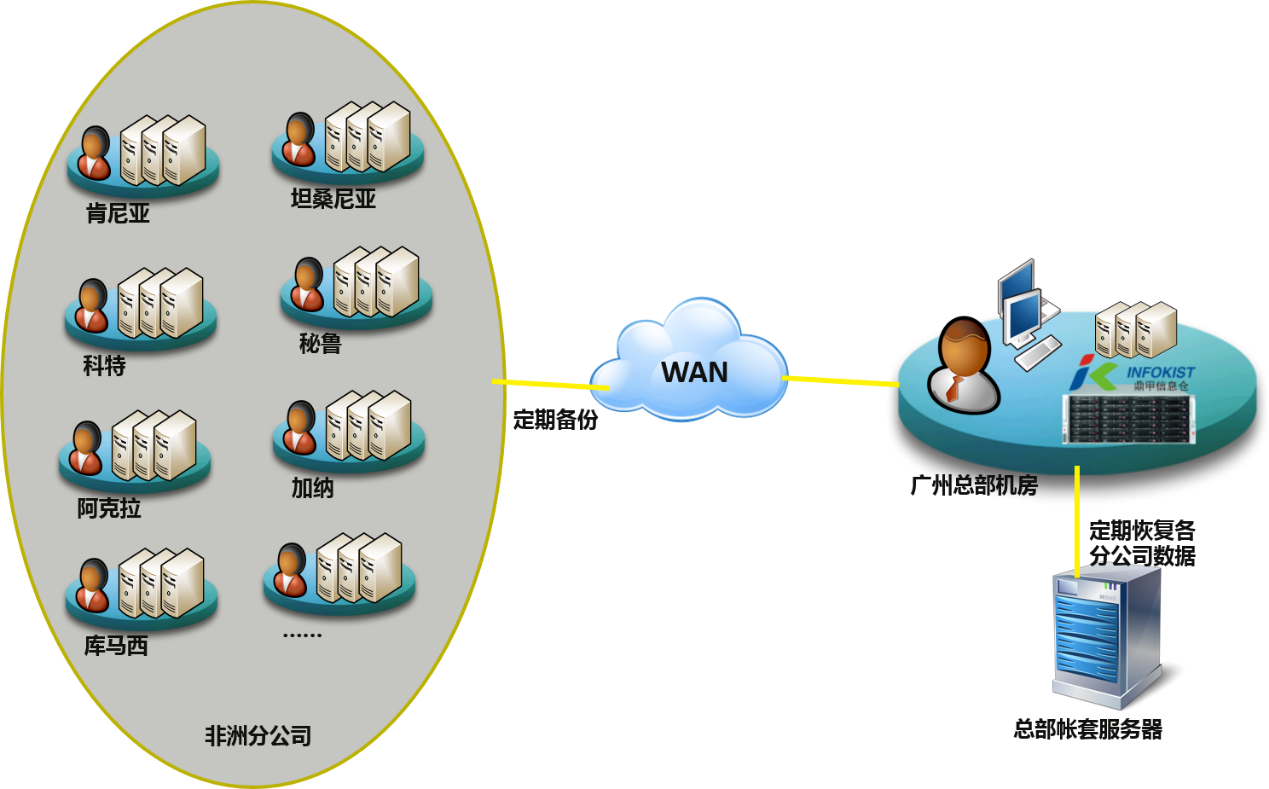 此前森達貿易公司主要依靠各辦事處財務經理手動進行數據備份,并通過ftp傳回到公司總部。由于非洲到亞洲網絡線路過長,線路質量差,部分辦事處到總公司的網絡甚至幾分鐘就會中斷一次,公司投入大量的人力物力來解決數據的備份及傳回,但效果不理想。公司上層已經意識到必須部署一套自動化的數據備份及自動恢復系統,來解決分公司的erp數據傳回,及恢復問題。