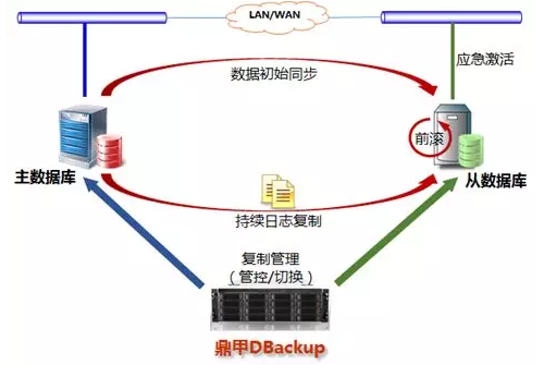鼎甲DBackup對Oracle、SQL Server、MySQL、達夢等數據庫,構建主/從數據庫環境,提供定時、準實時的數據同步復制保護。當主機數據庫發生故障時,可在維護人員進行故障確認后,觸發主/從數據庫切換業務,DBackup將自動把將主庫變為從庫,從庫變為主庫,保障業務的連續性。