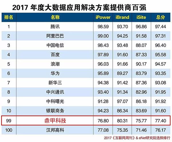 鼎甲與BAT一同列席《2017年度大數據應用解決方案提供商百強》