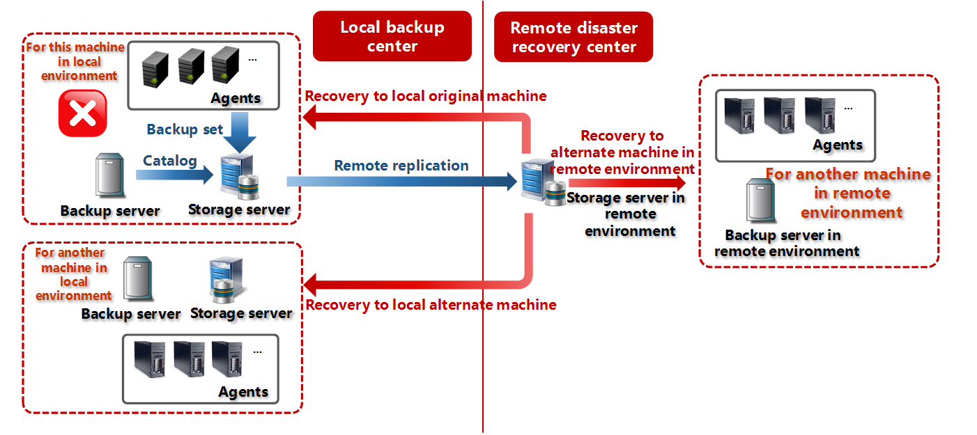 Scutech has put forward the notion ‘Two places, three centers’, which means by storing the same backup set on different nodes of different servers in different places, we can restore the backup either to the original or an alternate machine in the local center or in an off-site center once the local backup set is corrupted or lost.